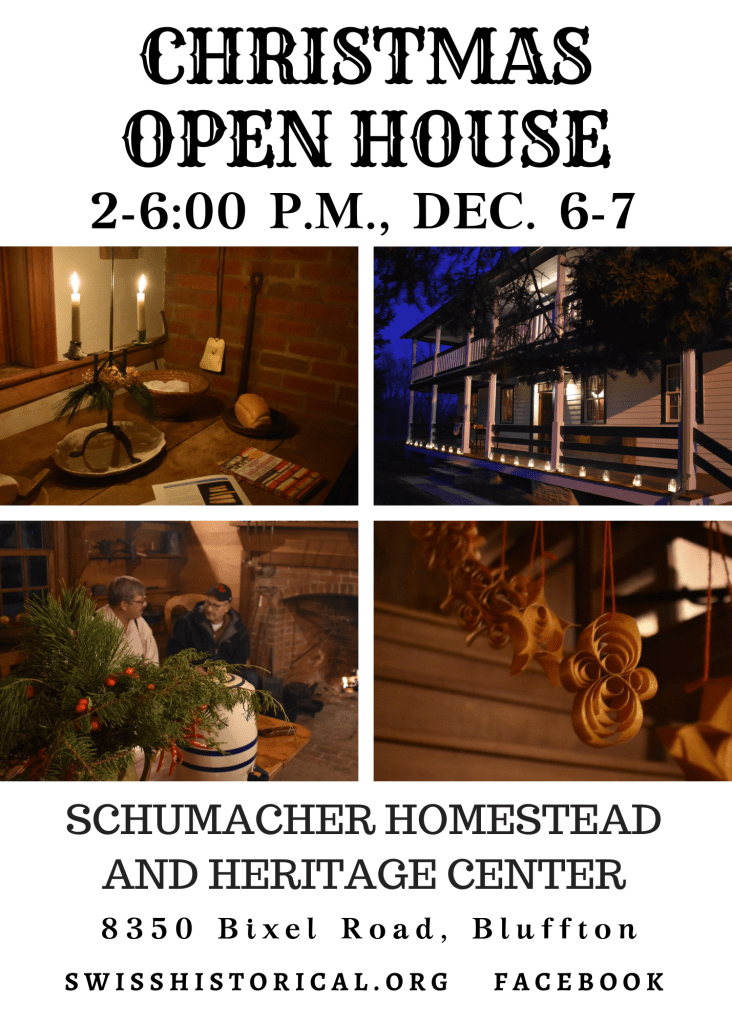 This event is free and open to the public, but donations will be gratefully accepted. The Schumacher Homestead is located at 8350 Bixel Road, approximately four miles from Bluffton.